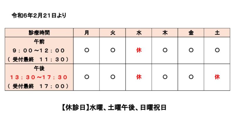 令和6年2月21日(水)より下記の通り、診療日時が変更となります。ご不便をおかけしますが、何卒、ご理解のほど、よろしくお願い致します。 岡宗歯科…